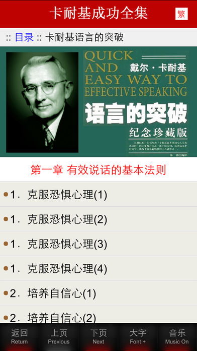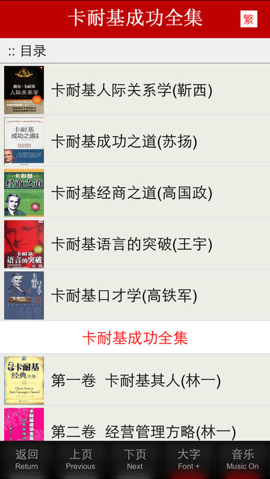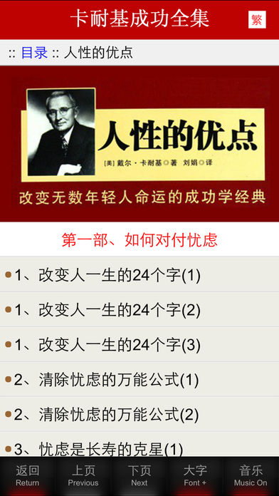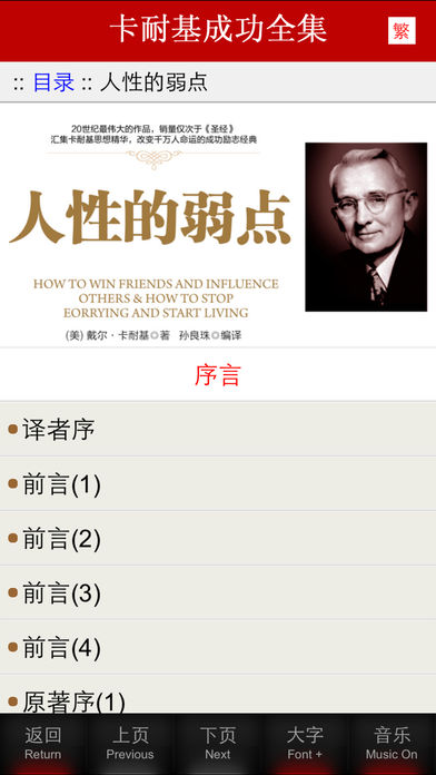 [简繁]卡耐基成功全集14部,精心整理,用心为你。 戴尔·卡耐基(Dale Carnegie,1888年11月24日~1955年11月1日),美国现代成人教育之父,美国著名的人际关系学大师,西方现代人际关系教育的奠基人,被誉为是20世纪最伟大的心灵导师和成功学大师。其在1936年出版的著作《人性的弱点》,70年来始终被西方世界视为社交技巧的圣经之一。 《人性的优点》 《人性的弱点》 《美好的人生》 《快乐的人生》 《卡耐基人际关系学》 《卡耐基成功之道》 《卡耐基经商之道》 《卡耐基语言的突破》 《卡耐基口才学》 《卡耐基成功全集 第一卷 卡耐基其人》 《卡耐基成功全集 第二卷 经营管理方略》 《卡耐基成功全集 第三卷 为人处事哲学》 《卡耐基成功全集 第四卷 形象设计艺术》 《卡耐基成功全集 第五卷 社会交往技巧》 WE Reader,为您提供最佳的阅读感受:技术创新点: 1 一键切换:简洁方便,在正常逻辑内,所有操作一键完成,不让您多点一次 2 树状分类:相对于一本书,WE Reader提供是一组书,例如,对于某本小说,可以将作者生平资料,书籍分析后记,书籍评论,全部组织提供给您 3 智能切换:翻页、章节、目录,全部智能判断,自动切换。支持任意位置添加目录自由图片 【简介】 ◆人性的优点 诺贝尔医学奖获得者阿列克斯·卡瑞尔博士曾经说:“不知道如何消除忧虑的商人,他的寿命将不会长久。” 卡耐基在本书中,通过对人性的研究,运用心理和社会学知识,对人类共同的心理特性进行了深入的揭示,并告诉我们认识自己、相信自己、克服“忧虑”、从而走上成功幸福的人生之路。 ◆人性的弱点 人类出版史上第三畅销书你一生中最重要的一本书,除圣经及论语之外,无出其右者。不管你是什么人,雄心万丈的青年企业家、业务员、家庭主妇、学生、热恋中的情侣,这都是一本让你惊喜,使你思想更成熟,举止更稳重的好书。我们相信这将是你一生中最重要的一本书。 ◆美好的人生 本书主要讲述的许多普通人通地奋斗获得成功的真实故事,激励了无数陷入迷茫和困境的人,帮助他们重新找到了自己的人生。全书分为3篇(使人赞同你的12种方法、改变他人的9种技巧、使你的婚姻家庭更幸福)。该书先后被翻译成几十种文字,被誉为“人类出版史上的奇迹”,无数读者由此走上了成功之路。 ◆快乐的人生 《快乐的人生》是卡耐基最具影响力的书籍之一,主要告诉我们如何修养心态,获得快乐的一些基本原则。这是一本引导我们踏上快乐人生的指导书。生命的意义,不在于我们走了多少崎岖的路,而在于我们从中感悟了多少誓理。这些亘古常新的人间智慧将帮助我们认清真正的人生和真正的快乐。 ◆卡耐基人际关系学 谁都明白处世之难,谁都渴望处世圆满,我们常常会因各种各样的人际关系不和谐而苦恼和惆怅。对一个经营者来说,与处理企业的资金和财物相比,处理人际关系更为艰难。 本书详细介绍了卡耐基对处世之道的深入探究,提供了卡耐基圆满解决人际关系的成功经验。其中,既有他自己的亲身经历,又有他为各方人士开出的“妙方”。学习卡耐基的处世艺术,对渴望成功的企业家和经营者大有裨益。 ◆卡耐基成功之道 讲述了卡耐基不平常的成功历程。它告诉我们,人生的目标是事业成功的精神支柱,抓住目标并为之而奋发努力,成功就在眼前;同时,善于巧妙地把握人生的机遇、设计切实可行的行动计划也是成功的一大关键。我们可以从卡耐基的成功经历中深深感悟到,成功与每一个人都有缘分,千万不可让它从我们身边悄悄溜走。 ◆卡耐基经商之道 卡耐基在经济领域的成功不仅在于出色地经营了自己的企业和人生,而且在于他能将经商术完美地传授于他人,培养了一批又一批成功的企业家。在欧美的工商界,言必谈卡耐基,许多人以参加过卡耐基训练班为荣,借以表明自己所受的无可挑剔的经商智慧教育。 ◆卡耐基语言的突破 《语言的突破》一书影响了千千万万人的说话方式。本书内容包括打动人心的交际语言、成为一个赞美高手、不伤和气的批评艺术、轻轻松松说服他人、高超动人的演讲术、掌握谈判的技巧、充满魅力的辩论术等内容。 ◆卡耐基口才学 卡耐基是美国著名的企业家、教育家和演讲口才艺术家。在本世纪,卡耐基演讲口才艺术曾风靡世界,掀起了一股经久不衰的卡耐基口才热,使亿万人获益非浅。本书不详细地介绍了卡耐基演讲口才方面的方法和技巧,而且根据国外最新资料,全面地介绍了卡耐基口才艺术在商业和贸易谈判方面的具体应用,具有很强的可操作性。 ◆卡耐基成功全集 第一卷 卡耐基其人 ◆卡耐基成功全集 第二卷 经营管理方略 ◆卡耐基成功全集 第三卷 为人处事哲学 ◆卡耐基成功全集 第四卷 形象设计艺术 ◆卡耐基成功全集 第五卷 社会交往技巧