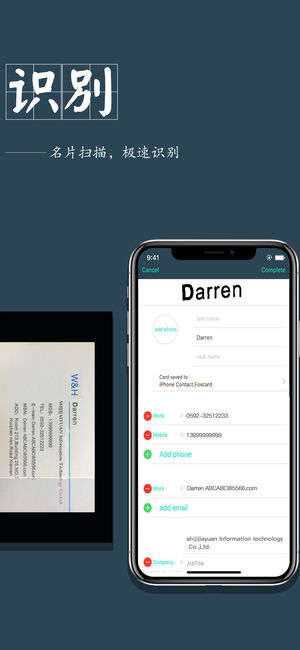 名片扫描王(FoxCard)是最专业的名片识别软件,拥有杰出的识别技术和最快的识别速度,可快速、精准识别多种语言名片,自动存入通讯录。 * “名片扫描王最好的OCR名片识别软件”—连线杂志 * “瞬间保存销售线索,销售人员必备软件”—华尔街日报 * “一堆名片一下子就全进了手机,用起来就是这么简单”—CNC 它还拥有不同于其他同类软件的特有的功能: 瞬间识别名片,迅速保存至手机通讯录; 为名片加头像、图文、备注; 完全本地识别不需要连接网络,保证数据绝对安全性。 识别语言:简体中文,繁体中文,英语,日语。 [我们的建议] 为了达到最好的效果,请确保您所拍摄的图片 ---- 越清晰越好…