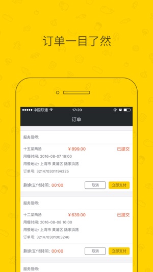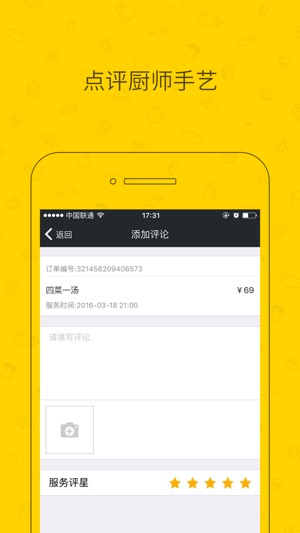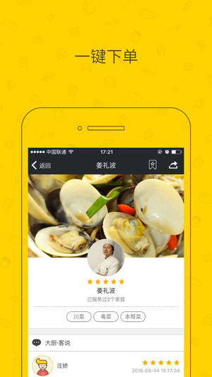 当您回到家中,饥饿难耐又不想动手做饭时,是否希望有位家人为你做一顿美餐? 不犹豫,来好厨师,全部帮你解决,一键式预约,立刻上门为您服务! 好厨师,把美味可靠带给您。 各个菜系大厨任您挑选,不同口味、不同风格的美食呈现在您面前。 健康有保障,完全不用担心餐厅使用不健康的食用油和添加剂; 在家就能办party,叫一个厨师上门,和朋友坐在客厅聊天,美食自有私人厨师全程搞定,请客倍有面子; 私人订制大厨,一键式预约,全方位服务您的舌头和胃! 好厨师,因“胃”懂你!