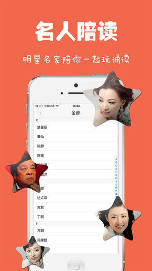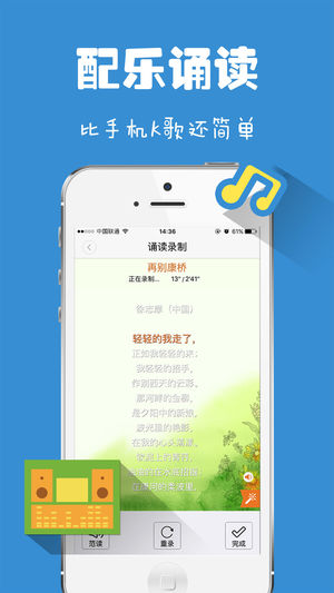 手机K歌一样“玩”配乐诵读! 全球独创、最火爆的随身配乐诵读录音软件! 能让用户们轻松、快乐赚钱的配乐诵读社区! 欢迎你来这里,诵好诗,读美文,诵读一切美好的事物! 你喜欢的诗歌自己读!你自己的诗歌自己读! 这里帅哥、美女扎堆!这里名师、明星云集! 这里有最美妙的声音!这里有最走心的朋友! 我想跟大伙儿说的是, 在我们的学生时代, 你一定朗读过课文! 在广播里,在电视里,在舞台上, 你也一定欣赏过配乐诵读! 在手机上,你也可能用手机K过歌! 那么在这里—— 你可以好好地过一把瘾! 随身随地像手机K歌一样, 来一段配乐诵读! 在这里—— 你可以读名家名作! 你可以读古今诗文! 你可以读…