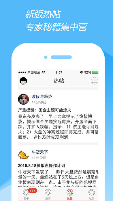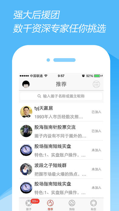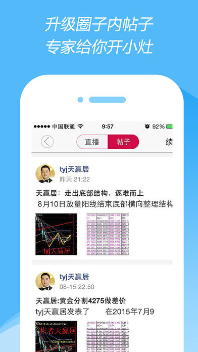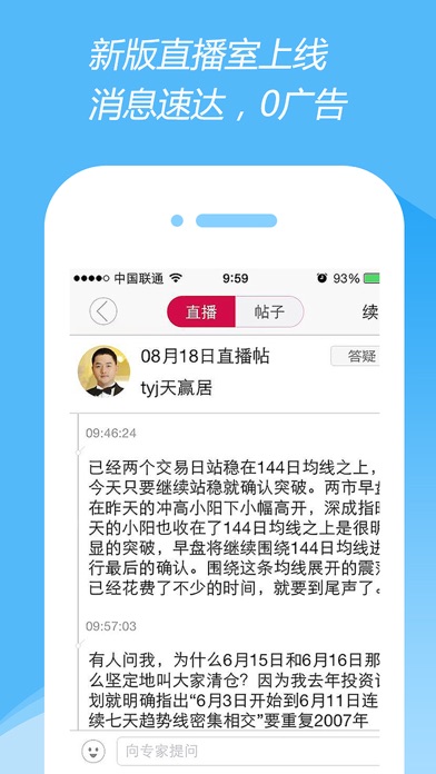 数千专家每个交易日股市直播,指点迷津。天赢居,股海指南针,天津股侠,少爷团队顾问等知名专家悉数登场,为你征战股市。 专家直播室消息实时推送,轻松跟随。直播室中只有你和专家的发言,轻松无干扰。直播室私信提问,隐私保障。 中金在线手机网:http://3g.cnfol.com/