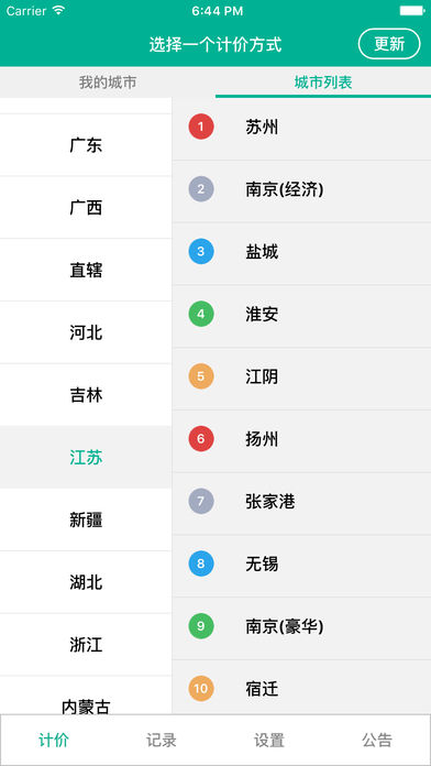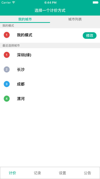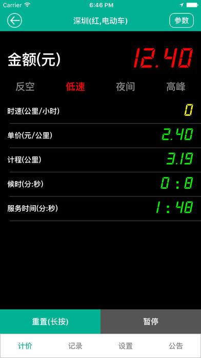 多城市出租车计价器,支持反空,低速候时,夜间时段,高峰时段,以及多少米跳表,侯时多少秒跳表,金额是否四舍五入,免费侯时时间等共计42个计价参数。 提示: 本产品计费无需网络.支持后台运行,可以后台计价。 在后台运行GPS全球定位系统,会使用更多电量。