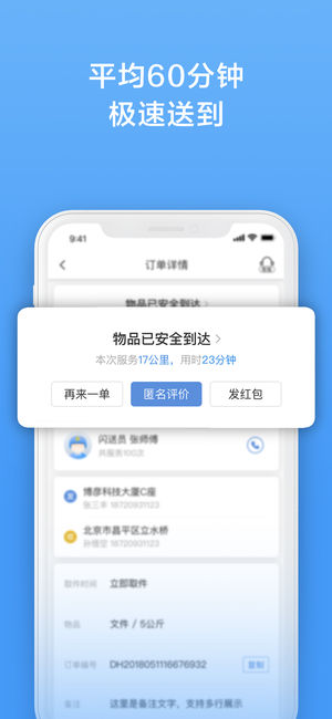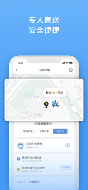 【闪送特色】 随时下单,即刻上门:无论何时何地,无需预约,闪送同城快递24小时静候您的召唤。 安全便捷,专人直送:闪送员即取即送,配送无中转环节,直达目的地,全程实时监控,先行赔付保障机制。 同城平均60分钟,极速送达:5公里平均23分钟送达,10公里平均33分钟送达,15公里平均39分钟送达。 【闪送服务】 闪送APP下单后,同城平均1分钟响应、10分钟上门、60分钟速递全城:同城美食配送(生鲜、水果,蛋糕、零食、外卖等)同城急件配送(合同、文件、发票、身份证、护照、钱包、钥匙等)同城购物配送(鲜花,药品,烟酒,宠物,书籍、服装、数码产品等) 【体验闪送】 新用户可通过下载APP、微信…