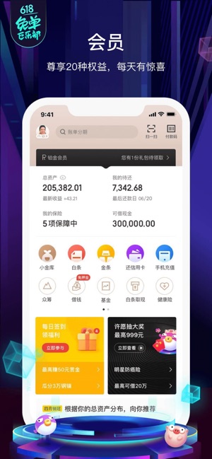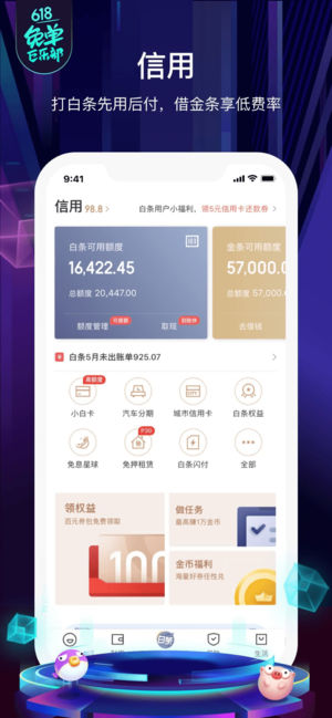 【单单返奖金!全民抢免单!最高返1万 】 • 5.24-6.20 下单就返,每单都有回头钱! • 20:00 狂欢摇免单,更有8,888元立减券、888,888体验金拼好运! • 天天白条12期免息,¥0.01超值券包不停送! 这个618,京东金融用奖金!犒!赏!你! 京东金融App,生活总有小甜头—— 在这里,您可以轻松解决和“钱”相关的问题:【安心赚钱】【任性花钱】【轻松借钱】【支付省钱】【畅快谈钱】,更有小白理财、保险、签到、早起打卡、等贴心服务。 【安心赚钱】 活期小金库,灵活存取,大额转入极速到账。 定期、基金、股票、黄金,品类齐全,灵活稳健。 独有“基智账户”,为您提供科学专业…