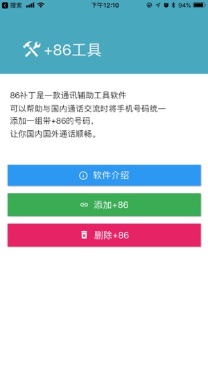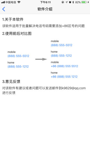 1、该软件适用于批量解决电话号码需要添加+86区号的问题 2、添加了删除+86按钮:如果你不再需要+86前缀,那么通过这个功能,可以删除+86前缀,并且删除重复的号码字段。 3、对座机做了判断:在添加+86前缀时,对座机号码做了特殊判断。也就是说您号码簿里面的座机号不会出现+86前缀。 4、如果感觉软件和您心意,希望能给一个好的评价 5、对该软件有建议或者问题可以发送邮件到k9629@qq.com进行反馈