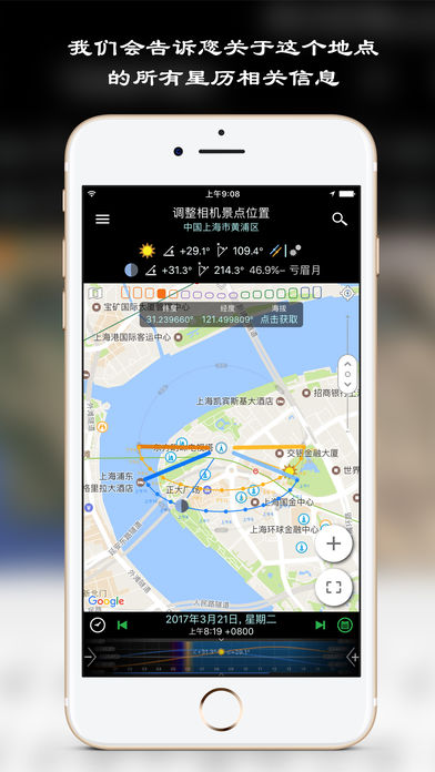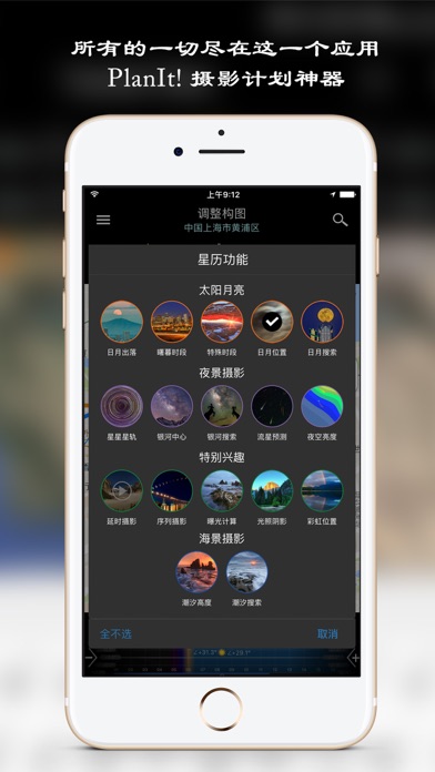 也许您正在寻找一个这样的应用,可以帮助您计划风光摄影各种细节。不用再找了,这个应用就是,它就是PlanIt!。不管您喜欢风光摄影的哪个方面,旅行,城市,自然,夜景,星空,银河,星轨,延时,这个应用都可以帮助到您。 著名美国摄影师安塞尔•亚当斯在他的第一本书《Taos Pueblo》强调了“可视化”的概念。他提出“预可视化”,也就是说摄影师应该在按下快门之前就想象出最后出来的照片会使怎样。当然,很多伟大的照片是即兴拍摄出来的,但是对于风光摄影师来说,如果可以提前预见到场景的样子会很大程度上避免因为没有准备好而错失良机,也会大大增加出好片的机会。 英文视频教学: https://www.youtube.com/watch?v=bna8_Mj8Bso&list=PLTmlTTxPbBbeu8Yx4paLUytV8z60SSL_w 中文视频教学: https://www.youtube.com/watch?v=70_M2tDmyec&list=PLTmlTTxPbBbc99ojiYHmt_HiLTqXODpk3 或者 http://list.youku.com/albumlist/show/id_49707951.html?sf=10101 现在科技发达,摄影师可以使用很多不同的工具实现场景的预可视化。当然,手机应用就是很多这样的工具之一,而且越来越流行。我们这个《PlanIt!摄影计划神器》(简称Planlt或者planit) 就是这样的一个全功能的应用。它巧妙地利用地图结合各种摄影工具和日月银河星历功能,来实现场景预可视化。 在这个看似简单的应用里面,我们加了很多的功能。比如说任何地点的GPS坐标、海拔高度、两点距离、海拔高度差、以及从某一点是否可以看到某个景点。这些信息不单对摄影师,可能对很多热爱旅游的人来说,都是重要的。而对摄影师,我们还专门提供了焦距(水平方向和垂直方向),景深、超焦距和全景工具。不仅如此,我们还加入了星历表的功能。这样您就可以查到任何一天任何地点的日出日落时间、月出月落时间、曙暮光开始结束时间、黄金时段、蓝色时段。甚至任何时刻的太阳和月亮的位置你都可以查到。还有星星、星座、银河、星云的位置。另外还有星轨计算器和延时摄影计算器功能,曝光自动计算,ND滤镜计算器。可以说是风光摄影需要的功能,应有尽有。和其它类似应用不同的是我们这个应用把上面提到的所有功能都在地图上或者取景框方式下直观地显示出来,各个功能之间还可以结合使用。