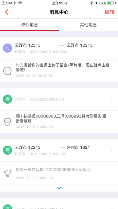 顺丰速运iPhone版是基于iOS操作系统开发的个人快件管理软件,免费为您提供自助下单、订单管理、服务查询等一站式掌上便捷快件服务。轻松寄件,尽在顺丰速运iPhone版! 软件特色 : Ÿ 快速注册 仅需10秒 Ÿ 智能寄件 安全管理 Ÿ 及时追踪 瞬间掌握 Ÿ 自助工具 寄件助手 Ÿ 您仅需花费10秒便可使用手机号码快速注册 Ÿ GPS地址定位、账户管理、寄件草稿箱,让您寄件更智能 Ÿ 运单扫描、快件信息主动推送、信息转发,让您随时随地掌握快件状态 Ÿ 运费查询、收送范围、汇率查询、服务介绍,让您全面了解收、寄相关信息及顺丰各项服务 主要功能: - 我要寄件—填写订单寄件 Ÿ 可设置默认寄件人 Ÿ 可将未完成的订单信息保存到草稿箱中 Ÿ 寄件时可进行运费查询、收送范围查询、禁寄品查询 Ÿ 可自动定位寄件人当前位置,以便填写寄件地址信息 Ÿ 可从手机通讯录或顺丰地址簿中选择收寄件人电话、地址信息 Ÿ 点击添加收件人,可以添加多个收件人;有多个收件人时,点击删除按钮可以删除收件人 - 我要查询—快件状态查询 Ÿ 可手动输入或直接扫描运单条码查询 Ÿ 点击单号进入运单详情,可编辑快件名称 Ÿ 点击推动通知,可以对快件设置推送 Ÿ 点击转发详情,可以通过邮件或短信转发快件的相关内容 Ÿ 历史记录 Ÿ 查件历史 Ÿ 订单历史 - 工具—寄件辅助工具 Ÿ 运费查询 Ÿ 收送范围查询 Ÿ 禁寄品查询 Ÿ 汇率查询 Ÿ 服务介绍 Ÿ 增值服务 Ÿ 我要建议 - 我的顺丰 Ÿ 使用当前手机号码快速注册 Ÿ 账户管理 Ÿ 寄件人地址簿 Ÿ 收件人地址簿 Ÿ 寄件草稿箱