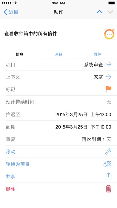 全新 2 周免费试用!OmniFocus Standard 及 Pro 版目前采用应用程序内购买,OmniFocus 1 及原有支持版客户可享有折扣。敬请下载该应用程序了解详情。 OmniFocus iOS 版让您触手可用桌面版应用程序的深入任务管理功能。凭借几乎可以随处调用的灵活的查看选项、位置感知以及动态任务条目,OmniFocus 成为您管理忙碌生活中方方面面的必备可信系统。按项目、地点、人物或日期对人物进行跟踪 — 借助 OmniFocus,您可以随时掌握重要信息。不管是购物清单、工作时要讨论的日程项目还是要在家进行的杂务,您可以在 iPhone 或 iPad 上清楚地看到这些东西。 OmniFocus iOS 版的界面采用了全新设计,以您的数据(您的资料)为中心而构建将其整理得更简单自然,不管您是使用 Getting Things Done™ (GTD™) 还是其他生产系统,都使您可以通过应用程序来快速理顺思路。它不仅自身功能足够强大,还可以通过云来与您的其他运行 OmniFocus 的设备进行同步(也适用于 Mac)。即使您并未使用 OmniFocus,也可以进行同步,这样您的信息就可以随时随地准备就绪。 STANDARD 功能(可通过应用内购买获得) • 使用我们免费提供的服务或您自己的服务器,进行可靠的推送同步OmniFocus 的同步格式经过加密,因此即使您的服务器泄密了,数据依然受到保护。 • 灵活的架构:可以将所有待办事项放入一张清单,也可以根据需要组织成由文件夹、项目、组和行动所构成的多个层级 • 根据位置、人员、精力程度来分配上下文 - 无论想使用什么来组织待办事项,都可以做到 • 通过列出基于位置的背景信息或在地图上查看,计划您一天的任务 • 今日任务扩展,可以在通知中心里显示今天到期的 OmniFoucs 项目 • 提醒捕获和 OmniFocus 信箱可以实现通过 Siri 或藉由电子邮件的 IFTTT & Zapier 等服务来输入 OmniFocus 动作 • 交互式通知,可以报告附近项目以及到期项目,您不需要打开应用程序就能将其标记为已完成(或推迟) • 搜索可以显示从当前视图或整个 OmniFocus 数据库中搜索到的结果 • 添加您设备上的照片和音频附件,并查看来自其他设备的同步附件 • 在主屏幕或工具条上,“预测”行向您显示接下来几天中有哪些项目将到期;打开“预测”透视以查看 iOS 日历中的事件以及到期项 • 专门提供了“检查”透视,确保没有遗漏 • 使用 Apple Watch 上的 OmniFocus,抽动手腕,即可查看最重要的项。 • 选择浅色或深色颜色调板,或者让 OmniFocus 随背景照明的变化而自动调整。 • 全新的应用程序锁定功能让 OmniFocus 的界面隐藏在 TouchID 或密码之后。 • 全新支持TaskPaper Text 及 omnifocus:///add 和 /paste URL,让您使用 Workflow 之类的应用程序,将复杂工作流自动化。 我们以稳定简单的用户体验作为起点,添加了一些 Pro 版功能,可以对 OmniFocus 进行定制,并让它更为强大: PRO 功能(可通过应用内购买获得) • 定制 OmniFocus 工具条和主屏幕,您可以像定制 iOS 设备的主屏幕那样对它们进行定制。 • 自定义透视:保存并重新访问特定任务或情况的自定义视图:“显示五分钟就能完成的杂务”或“我需要对计划会议的与会人员执行什么后续动作?” • 通过今日任务扩展,通知中心里提供了“显示所有”透视 立即下载 OmniFocus,开始免费试用!我们放入了一个入门视频,帮助您上手使用,另外我们的网站上还有大量的更多信息。 支持 如果您有任何的反馈或问题,敬请告知!Omni Group 可为您提供免费的技术支持:您可通过电子邮件 (omnifocus@omnigroup.com)、电话(1-800-315-6664 或 +1-206-523-4152)或 twitter (@omnifocus) 与我们取得联系。
