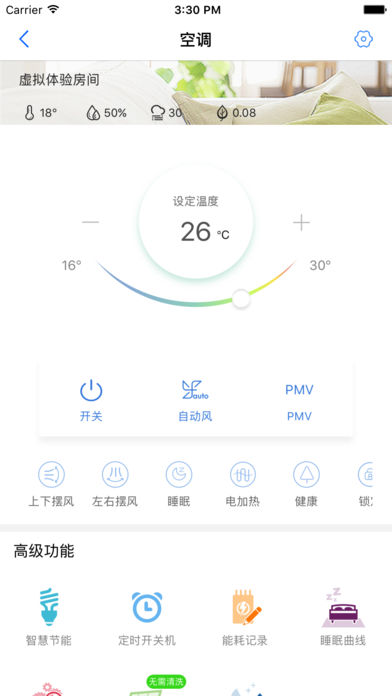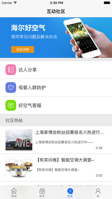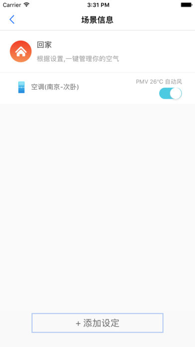 海尔好空气”使用新一代智能wifi模块,接入了开放的云端服务,配合海尔新的空气类智能产品发布的一款集成式app,在原有智能空调的基础上全面改版,融入更多的智能元素,全方位的给用户家庭空气类相关的智能产品提供各种服务,打造舒适健康清洁的家庭空气环境。 离家、回家、晚安智能场景功能:用户可以使用智能场景功能,创建对应的智能场景信息,当用户回家时,只需要轻轻点击回家键,家中空调就会按照用户设置的信息自动开启;当用户离家时,只需要轻轻点击离家键,家中空调就会自动关闭;当用户准备休息时,只需要轻轻点击晚安键,家中空调就会按照用户设置的信息自动设置为对应的状态。