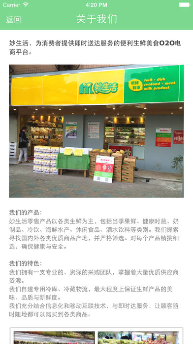 妙生活,为消费者提供即时送达服务的便利生鲜美食O2O电商平台。 新鲜水果、优质奶制品、进口零食,30分钟美味速达!上海吃货生活必备 本应用为妙生活官方客户端,为您提供便捷的生鲜美食信息展示、线上购买、在线支付、订单查看、订单追踪、第一手优惠资讯等功能。 妙生活精选全球时令生鲜美食,细心管理,用心服务让客户放心享受水果美味。 妙生活希望与您一起追寻美味的踪迹。我们专注于品质和服务!坚守食品安全第一!我们相信因为用心,所以专业! 产品特色: 1.简单快捷的浏览、购买流程; 2.对购买的水果可进行食用评价和信息分享; 3.可根据您的喜好以最小订购单位进行水果选购; 4.可选择货到付款及在线支付等多种支付方式; 5.水果新鲜,品质稳定,不满意无条件退换; 6.线下门店即时配送,30分钟确保送达。 妙生活承诺:不满意无条件退换 官方网址: http://m.chisg.com/