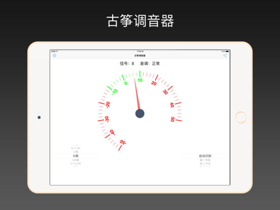 该应用专门为古筝调音开发,根据古筝特点应用独特算法作调音修正,适用于各类古筝的音弦音准校正,适配古筝所有调式。其主要特点是: 1、专门为古筝设计,包括各种调式和音准测试,不同于一般的调音器。 2、应用了多种音准测试算法,综合评定声音,校正音准; 3、不仅有常用的”D调“,而且还包括了所有12种调式; 4、应用简单明了,即使是古筝初学者也不需要指导即可使用;
