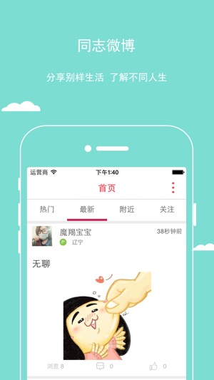 【全国最大同时支持男女同志手机应用】男女同志支持,找形婚不再困难-樱桃! 创新的微博交友模式,分享你的生活点滴,遇见懂你的人。 为全球同志人群定制,你可以通过樱桃发现身边的好基友,拉拉。查看Gay友或拉拉的个人资料,相册,文字。 与jackd、blued、zank、G友、the l(热拉)、乐do(lesdo)、拉拉公园等软件不同,樱桃是国内首款同时支持男女同志的同志软件。 [男女同志适用] 男同女同在一起方便您寻找您的形婚对象、gay、les密,可动态设置男同模式,女同模式。 [多国语言] 94个国家,82种语言互译,可以顺畅的和国外同志朋友交流,轻松寻找国外les和gay。 [秋波轰炸]…
