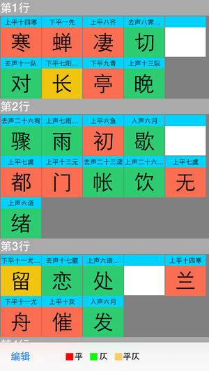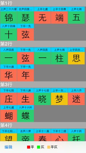 这是一款能够自动检查平仄,格韵的App,平仄格律基于平水韵。 支持简体/正体。 “平水韵”由其刊行者宋末平水人刘渊而得名。平水韵依据唐人用韵情况,把汉字划分成106个韵部。 每个韵部包含若干字,作诗词曲联用韵,其韵脚的字必须出自同一韵部。 时代发展到今天,出现了简体字正体字并存的局面,而在互联网上流传的平水韵也出现了很多版本,更是有很多错字误字混在其中。笔者已经用宋词三百首做过校验。 而现存宋词万首以上,如有漏字错韵的情况,烦请通过评论或者email通知笔者,谢谢。