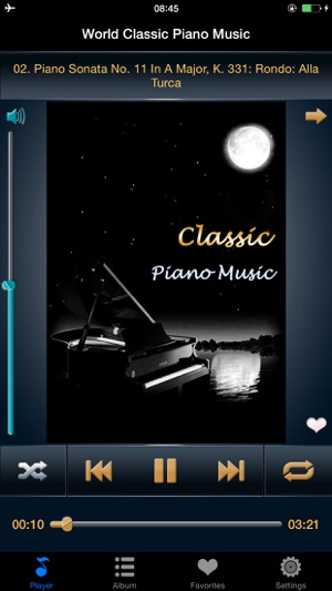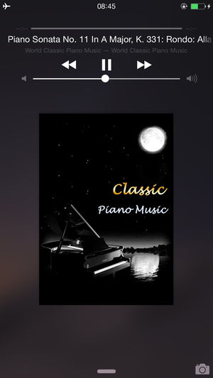 精选世界上最经典的钢琴曲目. 应用特色: -高质量的音乐 -播放顺序: 随机播放或按顺序播放 -重复模式: 单曲重复, 循环播放所有曲目, 循环播放收藏曲目 -后台播放 -锁屏时播放控制(播放/暂停/上一首/下一首) -摇一摇切换音乐 -睡眠定时 -不需要联网,离线工作