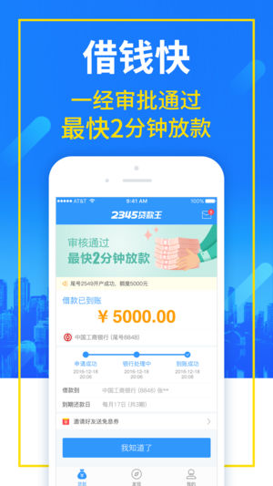 【产品特色】 1、门槛超低:无抵押、无担保、无面签,凭身份证就能贷款5000元; 2、审核极快:一键申请最快30分钟放款,简单、快速、借得到; 3、产品推荐:超多借贷产品一并推荐,随借随到。 【平台背景】 1、A股上市公司(股票代码:002195)上海二三四五网络控股集团子公司广州二三四五互联网小额贷款有限公司旗下金融产品,2000万用户力荐; 2、与持牌金融机构战略合作,联手打造; 3、通过银监会审核正规借贷产品,值得信赖。 【联系我们】 贷款王微信公众号:daikuanwang-2345 贷款王官方网址:daikuan.2345.com