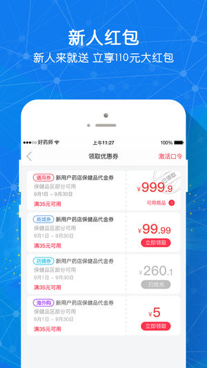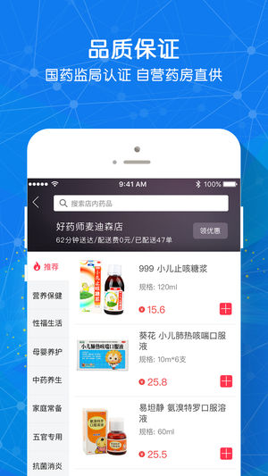 好药师掌上药店,国家药监局认证,好药师连锁药房直供药品,正品保障,特惠不断。 新人特权:注册即送150元优惠券; 有奖活动:步步为赢——走路赚金币,免费兑换领取各类奖品; 特色服务:寻找稀缺药——国产药、进口药、特种药,找遍全球,将药送至您身边; 专业服务: 7*24小时药事服务,物流配送覆盖全国; 999药箱,过期药品终身包换; 医护陪诊服务,护士陪您去看病; 配送范围: B2C业务:覆盖全国; O2O业务:目前已开通武汉、上海、北京、郑州、济南、福州、南京、昆山、新疆、芜湖、苏州、杭州、广州、天津、青岛共计15个城市站,以上城市支持急速送药上门业务。 【全】-品类多样 中西药品、保健品、食…