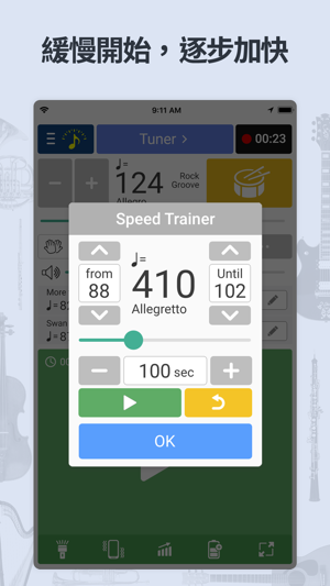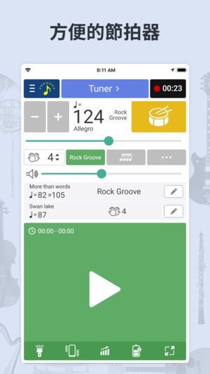 【免费调音器,节拍器】 易于使用且包含所有必备功能。 【只需轻轻一触,你就可以】 •开始/停止节拍器 •设置声音/闪光灯/振动/可视节奏的组合 •打开调音器 •记录乐器演奏的过程 •选择节奏模式 •使用黑屏电池节能模式 【用你的手掌盖住近距离传感器就可以】 • 载电池节能模式下停止节拍器 'Metronome' ========================================== 【功能】 •调谐有2种模式:(1)半音调音器(Chromatic Tuner),可测量声音音调和强度(2)音叉(Tuning Fork) •可自定义A4调音器频率(默认为44…