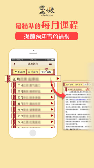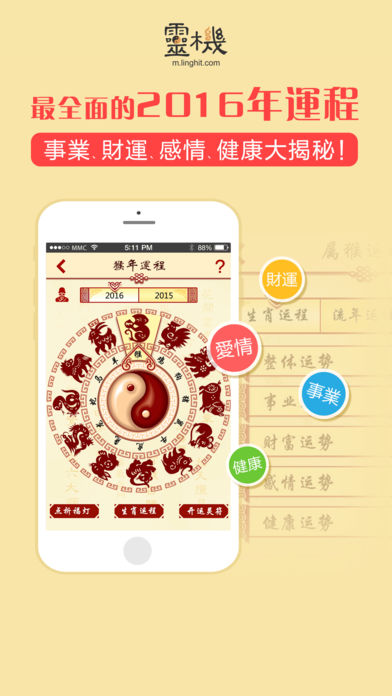 2016年事业、财运、感情运势如何? 2016年如何全方面提升自己的运势以迎接挑战? 2016年大师运势全面为你分析猴年运程,未雨绸缪提早预知运势变化! 【应用简介】 『2016大师运程』由台湾著名的命理专家罗镇老师亲自编写,为每一个生肖的的整体运势、五行运势、流月运势等命理运程方面进行了深入的研究,得出了这个最详尽的2016年运程预测。为大家分析2016猴年财富、工作、感情、健康运程运势变化、走向及化解之道,并且给大家提供了最准确的2016年十二生肖的凶吉运程和化解开运方法。 【大师介绍】 罗镇老师生于台湾命理世家,自幼研习手面相、阳宅风水。执业至今二十载,精通易经占卜、紫微斗数、八宅风水、玄空吉凶的绝诣。 2016年十二生肖运程预测是罗镇老师最新的运程命理的研究成果,他结合“五子运”原理,并和大自然进行了天人互动的交流撰写出来的。 “五子运”指按照古代历法里面的天干和地支再结合配合地球上四季气候变化来进行计算而得出的六十年流年运数分成五种不同属性的流年运数 【品牌支持】 灵机妙算是全中国和海外最著名和最专业的命理品牌,与上百位著名的命理老师合作,为大家提供最精准的命理知识和应用。 【应用特色】 1、台湾著名命理师罗镇老师亲自编写,内容丰富专业性、实用性强。 2、精准全面的运程分析,用户全面了解新年运势变化,逢凶化吉。 3、丰富民俗避凶方法,犯太岁生肖轻松化解。 4、十二生肖、具体年龄生人运程,流年、流月运程内容丰富详尽,可读性强。 5、操作简单,内容专业易懂,支持微信、微博分享,关心亲人好友一步到位。 6、界面精美,具有特色的中国风格,生肖剪纸,简约又显大气。 【联系我们】 网 站:http://m.linghit.com/ 新浪微博:灵机妙算 Facebook: https://www.facebook.com/linghit 网易博客:http://gzding.blog.163.com/ 微 信:灵机妙算(lingjimiaosuan)