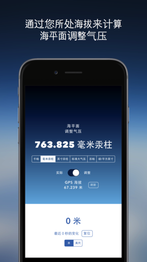 警告:仅适用于 iPhone 6/6s 和 iPhone 6/6s Plus。 这款应用程序可显示 iPhone 6/6s 和 iPhone 6/6s Plus 内置气压计感应到的当前气压。 您可以用各种不同的单位测量气压。 您可以通过 GPS 确定的海拔来估计海平面的气压,并与世界各地的气象站数据进行比较! 根据气压变化,应用程序可以显示距离您控制的复位点的大致海拔变化。