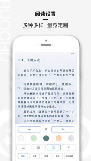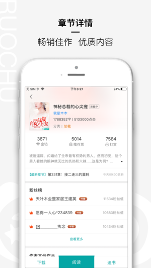 若初文学是北京黑岩信息技术有限公司旗下的面向女性用户的原创文学网站,旨在为所有喜爱文学的人提供新锐便捷的网络阅读和写作平台。 我们以婚恋、校园、灵异为主打题材,兼顾青春、奇幻、仙侠、宅斗、宫斗、总裁、同人等优秀内容分类。除内容建设外,从程序功能和页面设计上追求臻美品质,温馨的页面设计和简介无广告的阅读模式,保证了女性读者的完美阅读体验,深受500万年轻女性的喜爱。 ======主要功能====== 我的书架:与网站书架同步,用户在网站、客户端有统一的体验,且客户端增加了提醒功能 若初推荐:包括若初的精选作品、各种榜单 搜索和分类:直接搜索的作品,或者按分类查找作品 设置:个人信息的设置、充…