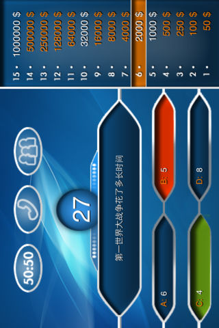 百万富翁 now avaiable for China. 百万富翁-这个游戏不但将会提高你的文化知识而也会将你跟朋友一起度过一个完美的时间。百万富翁-游戏不但测验综合知识而是也有指导性和娱乐性的活动。 问题库存 游戏中心 没网络 可以使用3个求助 其他特点 游戏中从50 $开始、通过15 个步骤、答对就会中将百万$ 在游戏中可以使用通配符来一半。 可以通话方式来求助,在这个项目中可以利用其他人的智能。 按难度,会降低答对效率 到了1000$和3200$ 你可以放弃回答问题。请报数给游戏中心。 每一个问题有限制几秒 答对所有的问题会成为百万富翁 -------------------------------------------------- ★百万富翁, wits its broad question archives and hard content, is waiting for you. While playing you will enjoy yourself and your friends. It will definitely end your boredom. With 百万富翁, most enjoyable moments are waiting for you. With the help of iMillionaire, you can both enhance your general knowledge and have amusing time with your friends. 百万富翁 is not only a general culture competition, but an instructive and amusing application. ★ Broad Question Archives: Thanks to its broad question archives, you will have a chance to meet various questions and compete as long as you want. You can compete with your friends and also check your abilities. Your general knowledge will enhance. ★GAME CENTER You can make your score written in Game Center. Your name can be seen among thousands. On the top of the list, you can say “here I’m”. ★ No Need Internet: You don’t need an internet connection. Without worrying, you can play wherever you want, on the bus, underground or at your office or home, ★ 3 Jokers Option You can call your friends or ask audience and you can also have a chance to choose in half option to know the questions. With the help of artificial intelligence, while you are using your jokers, it will direct you according to the difficulty levels of the questions. ★ OTHER FEATURES ✔ Starting with 50 euros, you can reach 1 million euros in 15 steps. While playing, you can use your in half option ✔ There is a telephone joker option, in this section, artificial intelligence application has been used. According to its difficulty level, the chance of giving the right answer is reducing. ✔ There is 1000 Euroand 32000 Euro grades. You can save your score at the game center ✔ You have seconds limit for each question. ★If you know all the questions, you will be a 百万富翁 ★ Good Luck!
