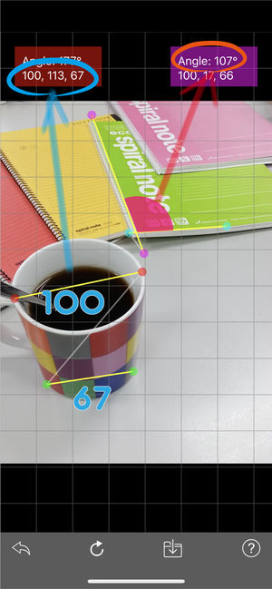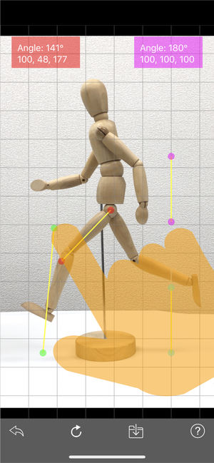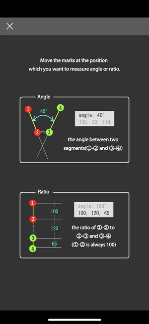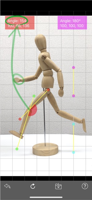 "Angle & Ratio" is a useful tool that you can measure the angle or ratio using a picture. You can create segments by moving the marks freely, so you can get the angle of arms or legs, or inclination of body. These segments are used to measure of ratio. Of course, you can save the result as a JPEG…