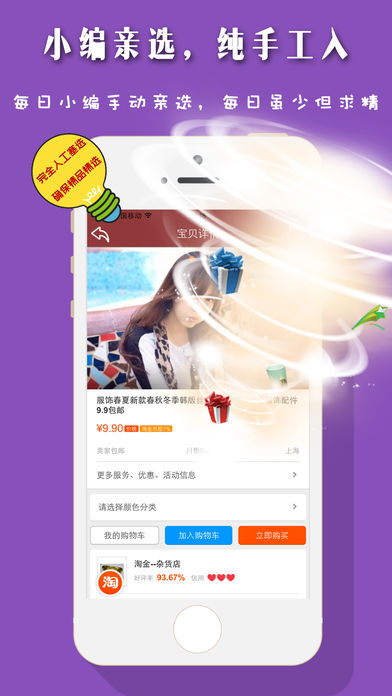 专业百人编辑团队人肉搜寻多款淘宝爆款宝贝,价格低到你想不到,全网最in的导购类软件! 折上折精品购专业版-2015最火爆的导购应用!9000万网购达人推荐! 折上折精品购专业版-为爱美爱淘宝的你精挑细选超值宝贝,全网最低价,全场包邮! 【四大特色】 精挑细选:每天更新数款最超值宝贝,都是小编从上万件商品中精挑细选而来!数量不多,但每件都是超值精品,错过就后悔! 专业砍价:淘宝天猫独家折扣,我们帮您砍到最低价,商家吐血赔本只为销量,只在折上折包邮! 专业验货:虽然低价,但保证质量!我们帮您验货把关,每天几十万次交易零差评,让您买得放心! 全场包邮:全网最低价,全场包邮!无需注册,一键登录淘宝,轻松购物! 【联系我们】 开发商: NewLine 商务QQ:63894876