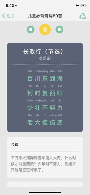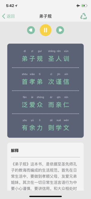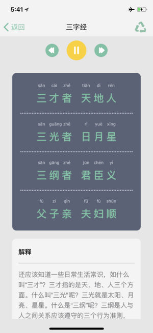 重要提示:APP所有的数据均为离线数据,为了安全APP需要进行网络检测. 软件特色: 1、集成了国学中最精典的:三字经、弟子规、千字文、论语、增广贤文、诗词、幼学琼林、笠翁对韵、三十六计、诗经 2、10大版块全部由专业的主持人配音朗读。 3、全拼音对照,阅读更加方便。 ◎三字经 《三字经》,是中国的传统启蒙教材。在中国古代经典当中,《三字经》是最浅显易懂的读本之一。《三字经》取材典范,包括中国传统文化的文学、历史、哲学、天文地理、人伦义理、忠孝节义等等,而核心思想又包括了“仁,义,诚,敬,孝。”背诵《三字经》的同时,就了解了常识、传统国学及历史故事,以及故事内涵中的做人做事道理。《三字经》…