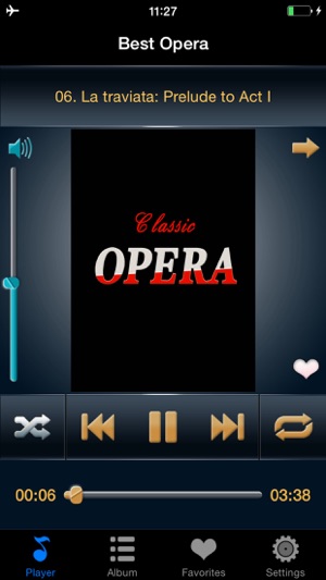 精选最经典的歌剧 应用特色: -高质量的音乐 -播放顺序: 随机播放或按顺序播放 -重复模式: 单曲重复, 循环播放所有曲目, 循环播放收藏曲目 -后台播放 -锁屏时播放控制(播放/暂停/上一首/下一首) -摇一摇切换音乐 -睡眠定时 -不需要联网,离线工作
