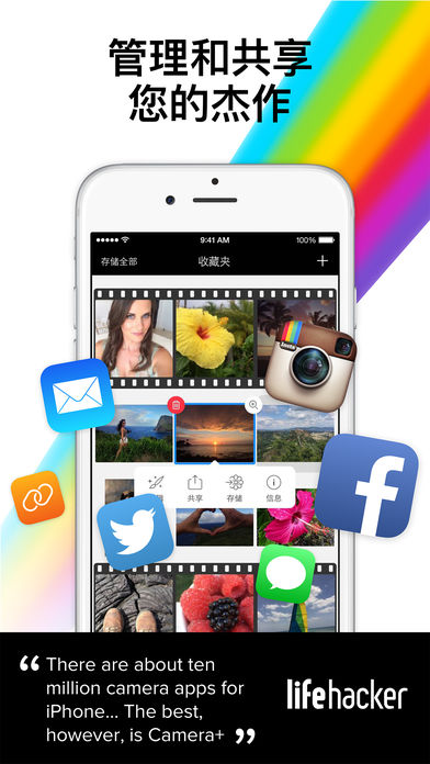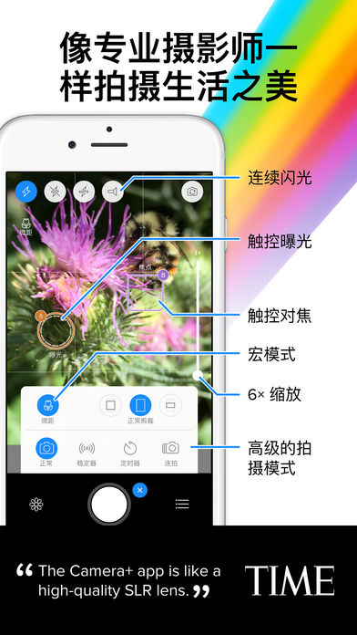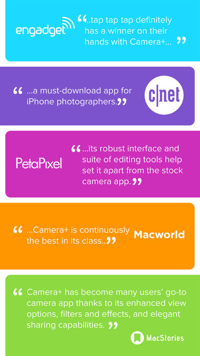 我们只有一个目标... 精彩的照片! 无论您是一位经验丰富的摄影师或是几乎没有接触过相机的新手, 相机+ 都将会使您爱上拍摄。 触控曝光与对焦 将曝光从对焦中分置出来。现在您可以很容易地控制照片的明暗度。 拍摄模式 使用稳定器稳定您的iPhone来得到最清晰的照片。定时器有不计其数的使用方式,包括拍最高品质的自拍。使用连拍来迅速拍摄所有的动作。 数码变焦 高达6倍的变焦及先进的数码处理为您提供优质的画面,轻而易举地打败竞争对手。 前置闪光灯 有多少次您想在一个暗的房间进行自拍但没有成功。现在好了,您可以马上拍了! 地平线水平 使用地平线水平,再也不用担心照片照歪了。 清晰度 清晰度是在图像处理上长期以来的一个重大的突破。清晰度分析您的照片并做出了一些智能调整,神奇地带出细节并给平淡的照片注入生命。通过使用清晰度,您以后就不会将不好的照片丢掉了。您会惊讶地看到它什么都可以修改, 甚至那些由于拍得太黑通常要丢掉的照片。 场景模式 大多数的现代数码相机都有场景模式来帮助您根据具体情况获得最佳的照片效果,为什么您的iPhone不应该有这个超棒的功能呢?相机+可以让您选择多种场景模式,包括美食,日落,夜景,肖像,海滩及许多。 特效 专业摄影师丽莎 伯特尼设计了一系列的令人惊叹的美丽效果。 用“高动态”来让您的照片微微发光… 用“摇滚”来让您的照片有着粗旷的效果… 想要用情感来填满照片就试试“ 移轴”吧。而这仅仅是冰山的一角,我们有几十种一键式效果来供您尝试,所以每次您都可以得到完美的结果 。 收藏夹 所有相机+拍摄的照片都放在我们具有创新性的收藏夹中,在这里您可以快速方便地浏览并删除不需要的。您只保存满意的照片,这会使您的相机胶卷一直都保持整齐干净。 共享 无论您是想与您的朋友和家人或整个世界来共享您的大作,相机+都能为您做到。您可以骄傲地将照片分享到Facebook,Twitter和Flickr上,或是用电子邮件或短信从手机里发出去。 iCloud 收藏夹同步 您的所有设备之间都可以自动同步相机+的照片。用iPhone拍摄了一整天, 晚上您就可以在iPad上编辑。 剪裁 如果您当时拍的不够完美,现在通过相机+就可以轻松解决这个问题了。当您想要有点创意时,我们为您设置了一堆流行的裁剪尺寸。轻点一下就可以让照片变方形,4×6,8×10等等。 边框 通过相机+,这些很棒的边框设计会给您的照片画龙点睛。从简单的黑色和白色边框,到更加粗旷的设计,您可以给照片添加精彩的润色。