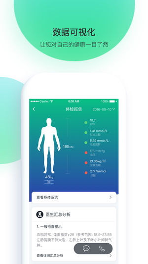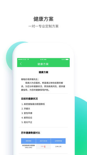 【微课堂】:汇集各领域医疗专家权威观点,整合成在线音频,利用碎片时间学习健康知识提高健康意识。 【健康方案】:私人医生结合您历年体检数据、生活习惯、日常慢病指标等为您综合分析健康状况、评估疾病风险,提供最适合您的健康改善计划。 【异常跟踪管理】根据您的体检结果中重要异常指标,个性化推送复查方案。 【健康报告】:检后及时查看体检报告数据,提供专业的体检报告分析,提醒风险检测项目。 【慢病管理】记录您的日常血糖、血压监测数据,按照日、周、月出具个性化分析报告,全面了解病情控制情况。 【体检检测预约】:线上快速体检预约,到院服务提醒。 【体检报告查询】:体检报告电子化,一键式导入,快捷查询您的历年体…