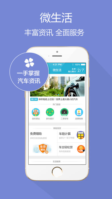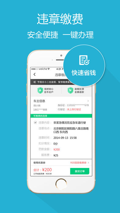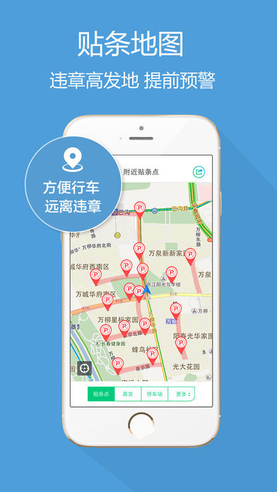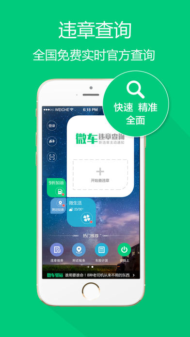 中国最好的车主服务APP 免费支持全国车辆违章查询300+城市,违章主动提醒,快速稳定 在线违章缴费、车辆买卖、司机招募等全方位用车服务。 -------优势功能------- 【主动提醒】违章查询、尾号限行、摇号结果,最新动态主动提醒 【车主服务】违章缴费、二手车买卖、汽车代驾保养、车主贷款,一键下单 【贴条地图】告诉你具体路段贴条风险,从此和违章停车说88 其他功能简介: √ 云端绑定:违章数据全保存,历史记录随时查 √ 违章预警:高发违章点、新增违章点重点预警 √ 我的钱包:账户余额、优惠券、交易记录一目了然 √ 天气指数:熟知每日天气温度、洗车指数 √ 销分、年检提醒:及时智能销分提醒、年检提醒 √ 个性背景:更多定制酷车主题、设计师精心设计的封面 √ 周边生活:快速锁定加油站、停车场、摄像头等车主关注地 √ 多车多城:同时查询多台车辆,多个城市的违章数据 【我们寄语】 用户群:257034393 合作服务: bdgroup@weiche.cn 我们不会停止对产品的热忱、对完美的追求!点点滴滴的优化,都为了给你最好的体验。如果在使用中有任何问题或者建议,欢迎联系反馈。 -----------------------