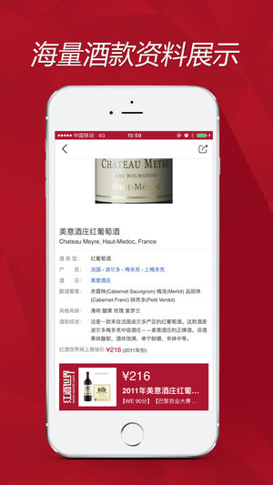 “红酒世界App”——由红酒世界网为葡萄酒爱好者免费定制的App工具,带您尽情畅游大千红酒世界。 App包含了三大核心功能 一、拍照查红酒 通过酒标拍照识别及关键词搜索,提供方便快捷查询红酒资料的功能。利用红酒世界网庞大的数据库展示酒款的产区、葡萄品种、酒庄、获奖、评分、权威评价等全方位的资料。 二、红酒知识大全 内置红酒知识速查手册,含有2,412条年份评级记录、6,410个全球名庄简介、1,254个葡萄品种知识、585个葡萄酒产区概况等内容。 三、官网商城 红酒世界网上商城从原产地精选、直采优质葡萄酒,设有跨境电商、2015波尔多期酒、优惠活动等专区,汇聚全球知名葡萄酒系列,包括“1855…