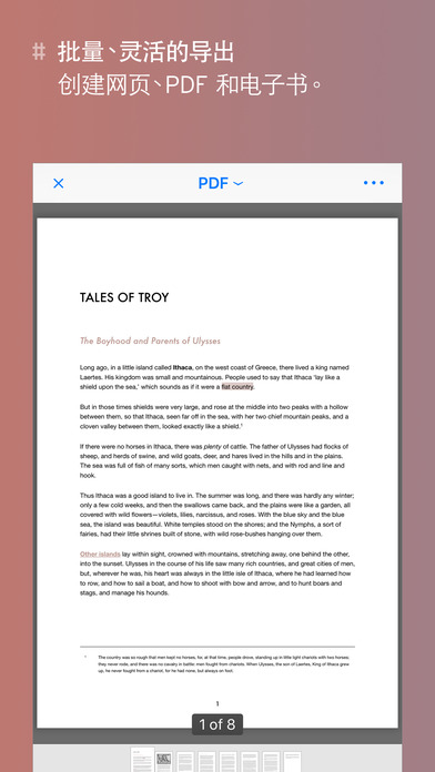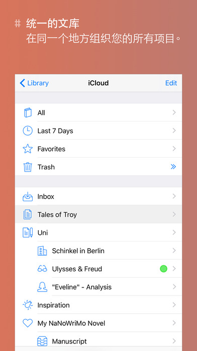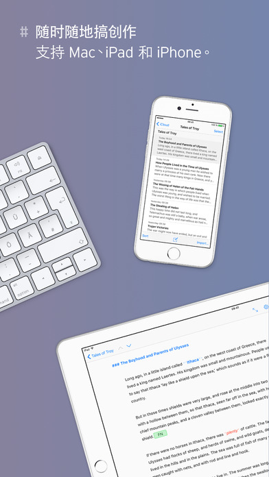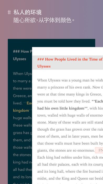 ++ 2016 年 Apple 设计大奖得主 ++ App Store 2016 年度最佳应用 ++ “这款应用非常棒。用起来非常顺手。做的不错。” – 畅销书作者 David Hewson “很难想象在任何平台上都能获得如此出色的体验。” – Macworld “它是我的 iPad 上最好的一款文字处理器,用它写作从不分心,还可以用它做笔记,一款可以静心使用的应用。” – The Brooks Review ### 桌面级写作应用 ### Ulysses 是您在 iOS 上的一站式写作环境。无论您是小说家、记者、学生还是博客,如果您喜欢写作,而且经常写作,那么 Ulysses 可以为您提供一套独特的工具,涵盖写作流程的所有方面: - 功能强大、简单易用的文本编辑器。 - 熟悉、实用的文库。 - 综合、真正灵活的多格式导出。 当然了,写作类应用的核心是它的编辑器。Ulysses 被称为世界上最好的文本编辑器。它提供您所需的一切 – 从标记到图像和脚注,从链接到评论和代码 – 它仍完全保持置身事外的样子。使用此应用程序是一种非常美好、专注的体验,它将在手机上写作变得*很有趣*。 但是,由于 Ulysses 认真看待写作,所以它没有在编辑器上止步不前。它设有独特文库,能让您自由访问要写的一切内容,无论是片段、想法、博文还是手稿。每个文本都在您的指尖下诞生,Ulysses 可以灵活处理各种文本,从便签到日记,再到伟大的美国小说,以及它们之间的任何文本。 首先,Ulysses 提供完善的没有任何限制的 iCloud 综合同步功能。Ulysses 适用于您的所有设备,无论是 iPad、iPhone 还是 Mac,每台设备都可以访问您写下的所有内容。同步非常简单方便,而且可以自动进行。既不需要第三方应用,也不需要任何交互操作。如果您有 iCloud,那么就可以同步。 完成创作后,Ulysses 会将您的文本转换为精美的 PDF、网页、电子书和 Word 文稿。您可以拷贝为 HTML,存储为 Markdown,甚至发布到您的 WordPress 或 Medium 帐户中。导出与选择格式、样式或目标一样简单。是的,1-2-3。 ### 功能 ### iPad 和 iPhone - Ulysses 可以在所有设备上运行,从 iPad Pro 到 iPhone 4s 聚焦和高效工作 - 简洁、吸引注意力的界面 - 基于标记的文本编辑器 - 打字机模式 - 全屏模式 - 写作目标(字符、字、页等) - 综合文本统计 - 在受支持设备上支持 Split View、Slide Over 以及 3D Touch - 全键盘导航和外部键盘 - 完全支持 VoiceOver 书写和编辑 - 针对标题、列表、评论、引用、重要段落等简单标记 - 方便插入链接、注解和脚注 - 轻松粘贴图片 - 关键字、注释和图片附件 - 搜索和替换 - 拼写检查、自动修改、词典、听写 - 快捷按钮和屏幕键盘让编辑过程更轻松 文件和组织 - 所有文本采用一个文库 - Touch ID/密码保护 - 组、过滤器、喜爱、书签 - 粘合、分割与合并 - 按日期、标题或手动排序 - 导入 DOCX、Markdown 以及文本文件 - 编辑存储在 Dropbox 上的外部文本文件 - 全文搜索、Spotlight 集成 - 内置共享扩展 - 自动按计划备份 导出和发布 - 导出为 PDF、DOCX、RFT、TXT、Markdown、HTML 和 ePub - 发布至 WordPress 和 Medium iOS 和 macOS - 支持 iPad、iPhone 和 Mac - 完整 iCloud 同步 等等… ### 支持 ### 有关详情,请访问 ulyssesapp.com。您还可以通过 support@ulyssesapp.com 或 Weibo @ulyssesapp 与我们联系,我们期待您的反馈!