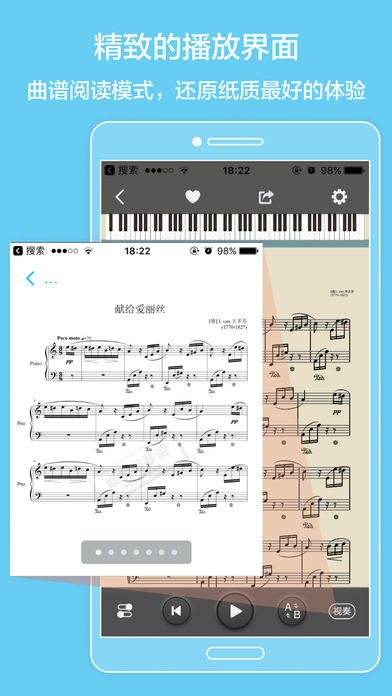 最全钢琴谱是一款全球最全的钢琴曲、钢琴谱库。集合了海量钢琴曲谱查找,精致的钢琴曲谱展示、播放的优秀应用软件。 我们致力于剥开繁杂的干扰,回归本源,让您体验到最专业,优秀的钢琴谱。 **App里有我们用心整理的钢琴曲谱专辑,包含流行、古典、轻音乐、爵士等音乐分类。