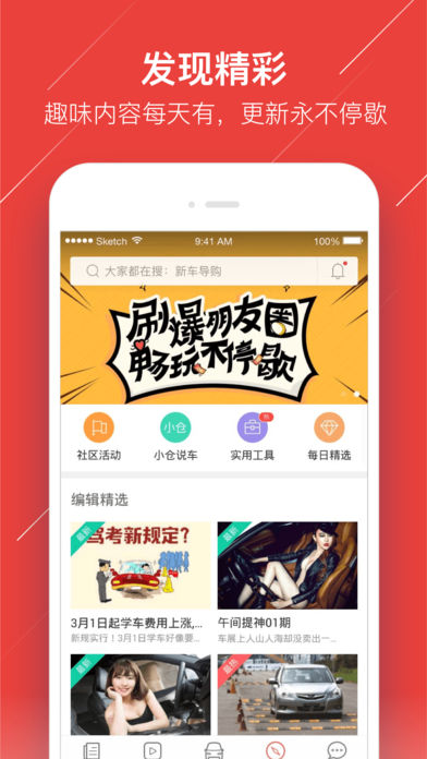 车友头条,驾考宝典兄弟产品,为您提供学车买车用车养车多场景内容服务,从学车菜鸟到玩车达人,我们都可以跟你聊一聊,让您一个app通天下车! 7*24小时不间断更新,最新汽车资讯一手掌握。 学车不知道有哪些坑?车友头条告诉你。 买车全包价、落地价到底是什么鬼?车友头条帮你来科普。 用车养车怎样少花冤枉钱?车友头条各种实用小妙招,帮你省省省。 我是菇凉,这些太枯燥,没兴趣看?不着急,我们还有为您细细挑选各种精选内容,茶余饭后、如厕睡前随便瞄几眼,就能获得撩男神插科打诨的超酷谈资,瞬间让男神对你刮目相看! 功能亮点 【头条】 1.聚合海量新鲜内容,下拉总有新内容,及时追踪汽车资讯热点; 2.娱乐化实用攻略,覆盖学车买车用车养车全场景; 3.汽车行业的“今日头条”,目前已收录汽车之家,易车网,太平洋汽车,爱卡汽车,新浪汽车,搜狐汽车,腾讯汽车,网易汽车,凤凰汽车等数百家汽车媒体资源,给你不一样的新鲜视角; 【视频】 不只是汽车,搞笑、美女、社会…边看边评欢乐多多; 【发现】 1.海量新车视频、车型评测精选内容,打造属于车友自己的汽车新闻APP; 2.刷爆朋友圈,好玩有趣停不下来; 【社区】 驾考宝典用户参与度极高的汽车论坛。汽车车迷的汽车之家,看车友互动吐槽不断,po美照、晒爱车。 【联系我们】 官方群:285948602 商务合作:app@mucang.cn 官方网站:www.mucang.cn