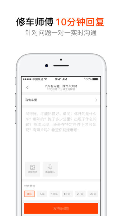 汽车问题在线解答 ,专业修车师傅10分钟回复。 目前已经拥有13万名通过汽车大师认证的专业4s店(5年以上经验)汽修技师,覆盖所有主流汽车品牌。专业,快速解答车主汽车维修、保养、用车等汽车问题。 中国车主最信任,最有口碑的汽车问题解答应用 产品特点: 一键提问, 快速解答 “汽车大师”界面直观,操作简单,让每个车主都能轻松上手,汽车有问题,轻松提问。 汽修技师,回答专业 平台拥有上万名专业汽修技师,均拥有多年汽修工作经验,专业快速解答车主汽车问题。 汽车品牌,覆盖全面 覆盖100多个汽车品牌,每一个汽车品牌都有专业的汽车技师在线解答,让车主放心。 高效匹配,即时回答 通过问答自动匹配系统,车主提问后,系统迅速匹配相应技师,10分钟解答车主问题。 汽车资讯,内容丰富 “汽车大师”内提供丰富、有趣的汽车百科知识、养修资讯,为车主保驾护航。 联系我们: 官方网站: www.qcds.com 微信公众号:qcds100 官方车友QQ群:424433231 新浪微博:@汽车大师 商务合作:biz@baichebao.com