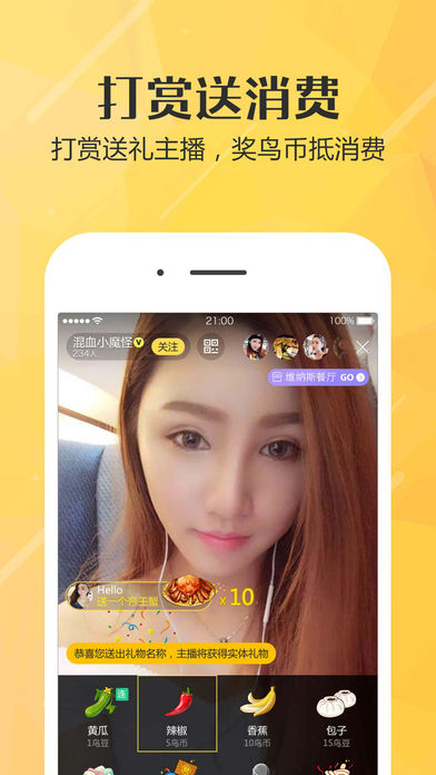 一个“会吃、好玩、享优惠”的食娱泛营销平台。 结合直播的即时宣传优势, 开辟垂直美食领域, 打造全新的打赏消费模式! 丰富的内容设置,友好的操作界面,时尚的视觉体验。 专业的探店食评,精彩的美食栏目,精选的优质商户。 【食色醉撩人,网红直播美味情报】 【美食体验官,包啖羊城饕餮盛宴】 【打赏送消费,全城享美味】 【吃喝玩乐购,惊喜优惠享不停】 美食,只看鸟人直播! 【联系方式】 感谢您体验寻蜜鸟APP,使用过程中,有什么想法、看法、说法、玩法、闹法、乐法,尽情通过以下方式反馈给我们的“鸟人们“,感谢支持! 客服热线:400-7766-333 微信:xunminiaofw 新浪微博:寻蜜鸟科技