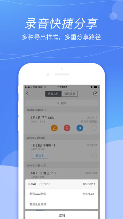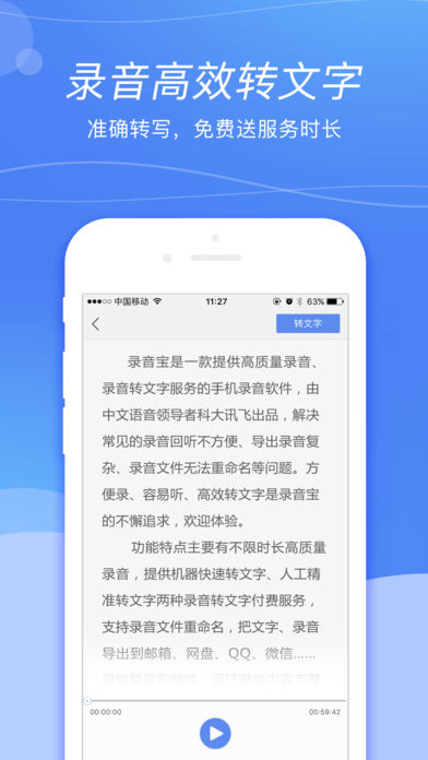 录音宝是一款提供高质量录音、录音转文字服务的手机录音软件,由中文语音领导者——科大讯飞出品,解决常见的录音回听不方便、导出录音复杂、录音文件无法重命名等问题。方便录、容易听、高效转文字是录音宝的不懈追求,欢迎体验。 【功能特点】 -不限时长高质量录音 -录音转文字付费服务:机器快速转文字、人工精准转文字 -把文字/录音导出到邮箱、网盘、QQ、微信…… 【场景举例】 -漫长的会议后还要整理混杂的录音? -为了赶稿听录音听得脑袋疼? -考证培训内容记不住、脑袋反应慢? -速录整理有遗漏?敲字速度慢? 以后你就休息吧,让我来帮你! 【联系我们】 QQ群:432835742 邮箱:luyinbao@iflytek.com 电话:4008110540