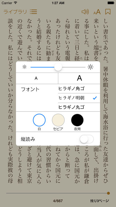 夏目漱石の文学作品を読む事ができる、電子書籍アプリです。 シンプルな操作でサクサク読むことができます。 【主な仕様】 ・iCloud対応 ・音声読み上げ機能 ・スワイプでページめくり ・縦横対応 ・しおり登録 ・目次表示機能 ・システム標準辞書搭載 ・縦読み機能(※iPhoneのみ対応) ・フォントサイズ変更 ・背景色変更( 白 or セピア or ブラック ) ・ダウンロード(約90作品の中から無料でダウンロードできます) 【注意事項】 ・初期データには作品は収録されていません。お好きな作品をダウンロード(無料)してお使いください。 ・作品のダウンロードは、3GまたはWi-Fiのネット環境が必要です。 【無料ダウンロードできる作品】 ・こころ・坊ちゃん・草枕・吾輩は猫である・それから・三四郎・道草・無題・明暗・正岡子規・虞美人草・三山居士・変な音・門・夢十夜・彼岸過迄・一夜・永日小品・行人・文鳥・私の個人主義・硝子戸の中・倫敦塔・幻影の盾・坑夫・二百十日・野分・思い出す事など・倫敦消息・イズムの功過・岡本一平著並画『探訪画趣』序・カーライル博物館・薤露行・学者と名誉・元旦・木下杢太郎著『唐草表紙』序・教育と文芸・京に着ける夕・虚子君へ・ケーベル先生・ケーベル先生の告別・現代日本の開化・琴のそら音・コンラッドの描きたる自然について・作物の批評・子規の画・「自然を寫す文章」・自転車日記・写生文・趣味の遺伝・初秋の一日・処女作追懐談・人生・鈴木三重吉宛書簡―明治三十九年・西洋にはない・戦争からきた行き違い・創作家の態度・高浜虚子著『鶏頭』序・田山花袋君に答う・『土』に就て・艇長の遺書と中佐の詩・手紙・『傳説の時代』序・点頭録・『東洋美術図譜』・道楽と職業・長塚節氏の小説「土」・中味と形式・入社の辞・『煤煙』の序・博士問題とマードック先生と余・博士問題の成行・長谷川君と余・「額の男」を讀む・文芸委員は何をするか・文芸と道徳・文芸とヒロイツク・文芸の哲学的基礎・文芸は男子一生の事業とするに足らざる乎・文士の生活・文壇の趨勢・僕の昔・マードック先生の『日本歴史』・満韓ところどころ・明治座の所感を虚子君に問れて・模倣と独立・余と万年筆・予の描かんと欲する作品・落第・私の経過した学生時代・『心』広告文・『心』自序・『心』予告・『三四郎』予告・『それから』予告・猫の広告文・『吾輩は猫である』上篇自序・『吾輩は猫である』中篇自序・『吾輩は猫である』下篇自序