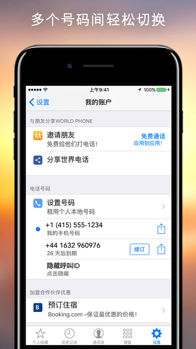 World Phone能够实现最清晰、最可靠的语音通话。以最优惠的价格进行最优质的全球呼叫和接听。 ** 特别优惠:现在就试试World Phone,用我们最新的应用程序至应用程序通话功能免费呼叫家人、朋友和同事。 ** 主要特点: 清晰可靠的语音通话 - World Phone会通过优质电话网路智能地为您选择语音通话线路,尽可能为您提供最可靠、最清晰的通话。 简捷的联系人 - 无需为独立的联系人列表而困扰。World Phone简捷地无缝集成您的iPhone现有联系人!您甚至能从手机的联系人列表进行World Phone通话。 Be Local - 毫不费力地租用应用内本地电话号码,用于旅行或与外地联系人和/或亲属通话。可提供70多个国家的号码! 与iOS 10完全兼容 - 无需再进行二等公民VOIP通话 - World Phone现在支持全屏来电通知、呼叫等待、呼叫保持、最近通话整合等。 World Phone现在更加完善了 - 马上尝试!