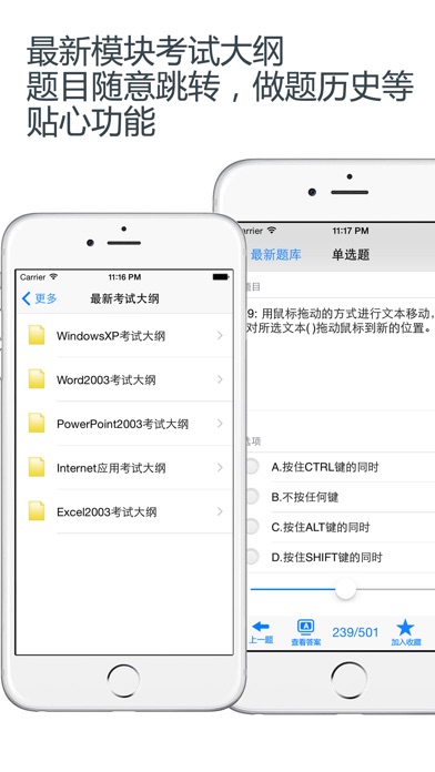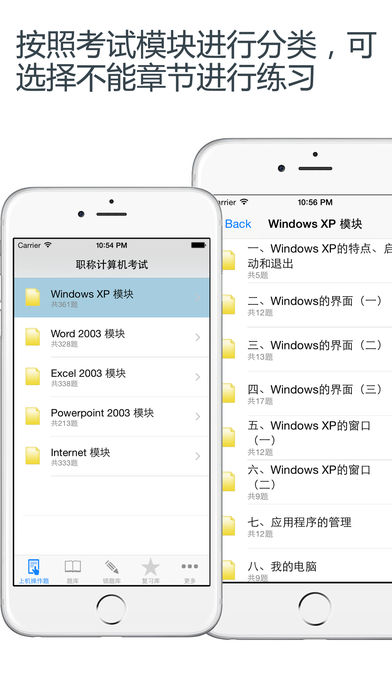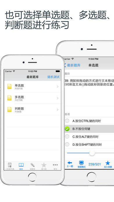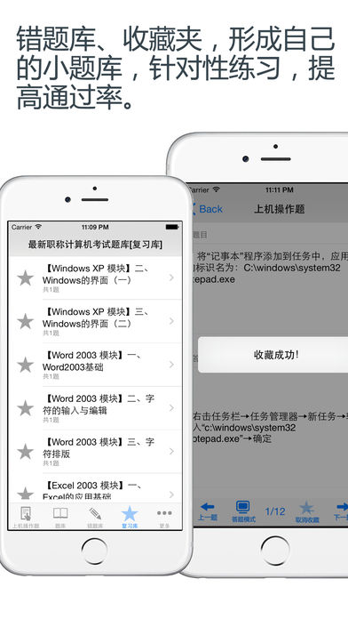 本软件为职称计算机考试题库的软件,精心准备了2016年最新考试题库。(共计3000多道)。主要以上机操作题为主,以及单选、多选、判断题型。为考试的提供了充分的复习准备,可随时随地学习练习,有效帮助顺利通过考试,学习知识通过考试必备神器! 职称计算机考试也是分级别,一般初级考两个模块,中级考三个模块,副高级考四个模块,高级考五个模块,你现在考初/中/副高/高级职称,只需考其中的两/三/四/五个模块。职称计算机常考5个模块:WinXP,Word2003,PPT2003,Excel2003,Internet。也是相对简单易考的模块,你可以选你最熟悉的模块去通过考试 【功能介绍】 1、上机操作题:最新题库,按照考试模块分类,可选择不同章节进行练习。 2、题库:最新单选题、多选题、判断题题库,可顺序、随机测试练习。 3、错题库:可自动加练习过程中错题加入收藏,以便反复练习。 4、收藏夹:可在练习过程中自行收录题目到收藏夹,形成自己的小题库,针对性练习,提高通过率。 5、考试大纲:最新各个模块的考试大纲。 6、安装后可离线浏览,不用联网也可以浏览,速度快,无广告。 7、支持同时在iPad/iphone/itouch等多种设备中安装。 8、定期更新题库。 9、可设置题目界面字体大小。