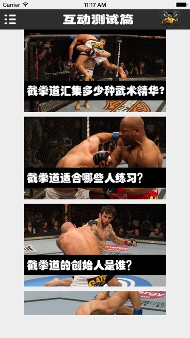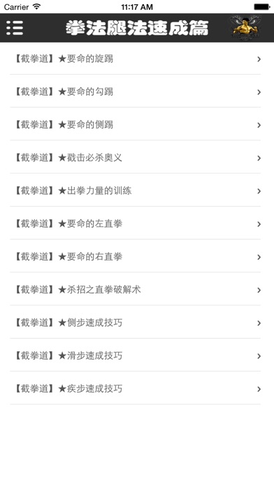 App Store中最据权威的截拳道宝典。让你可以在短时间内从菜鸟到高手的必备神器。 速成:只要你对武术有一点点兴趣,打开宝典看一看,分分钟让你成为武术界中的“战神”! 易学:我不是一本枯燥的截拳道教科书,用文字来阻碍你的行动,我是一个简简单单按照视频步骤动起来,就一定能够成功的宝典式App! 随时随地:利用你的任何时间,上班公交车,下班挤地铁,什么时候想看了拿出来看看,下次实战的时候照样做一做,你的朋友或队友就会明显感觉到你的水平在提升。 本App中还有动作巨星李小龙手把手为您演示,让您深度了解截拳道的各种炫酷技巧。