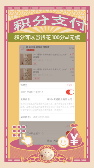 虹领巾是天虹商场为顾客量身打造的一款创新型APP,融合行业前沿的技术手段和优秀的品质服务为顾客带来全新的购物体验。 凭借其不断的创新和长久以来对品质的不懈追求,虹领巾荣获:2016 CCFA客户体验创新奖、2016年中国跨境电商凤鸣奖——十佳卓越零售商、2016年度微信智慧生活优秀案例奖。 --这样购物才够酷-- 【手机自助买单】 超市买单不排队?这种黑科技在天虹你就可以体验到啦!使用APP边逛边扫码,一键核验,就是这么酷炫~是时候换种姿势买单啦~ 【天虹到家】 没空逛超市?天虹超市两小时内直达到家,谁说在家不能逛超市? 【停车缴费】 进出天虹停车场,无需取卡,无需备零钱,手机一键缴费,虹领巾会员还有专属优惠呦~ 【购物卡付款】 绑定天虹购物卡,在超市百货便利店买单直接出示虹领巾付款二维码支付,再也不用携带购物卡。还能实时掌握购物卡余额,个人积分,交易明细情况等,购物更轻松。 --甄选品质有保障-- 【海外购】 我们严把质量关,精挑细选千余款品质好物;在全国拥有多家跨境体验店,在购买之前可先进行体验。全世界的美好生活从这里开始。 【品牌云店】 与品牌商联手打造全渠道专柜,将百货专柜延展到线上,在门店挑不到喜欢的?喜欢的鞋子却断码?调货太麻烦?试试品牌云店,这才是真正的专柜同款。 --一站式服务体验-- 【生活】 洗衣、洗家电、买电影票、代收快递......一个APP就能搞定~ (≧▽≦)/~,你只需负责貌美如花就好啦。 【积分】 会员积分可以进行停车缴费,兑换商品,还能直接进行线下买单支付,小积分大用途。 ——售后服务有保障—— 使用中如果有任何问题,可通过以下方式联系我们: 官方微博:天虹-虹领巾 官方微信:天虹(rainbow-cn) 客服电话:4008-295-295 客服小天时时在你身边!