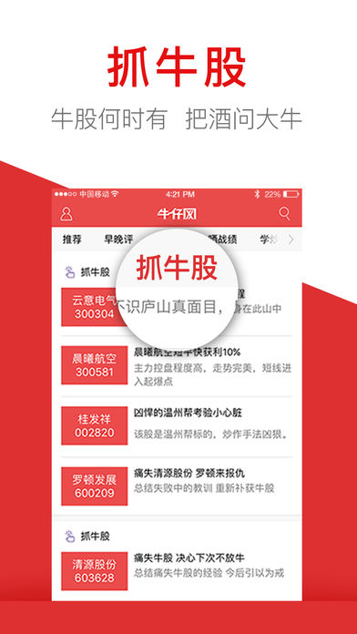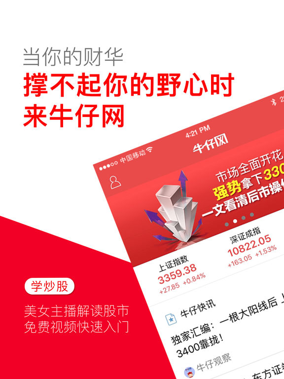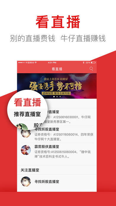 牛仔网-国内最大炒股高手股市直播社区,证券投资牌照:ZX0177。 牛仔网创立7年,云集中国股市精英股民、资深操盘手、持牌分析师每日在线解读大盘,跟踪实时热点资讯、财经要闻,从基本面+技术面结合丰富股市经验甄选优质好股票,即时图文直播,推荐买卖标的与点位,智慧分享让投资更简单! 核心价值: 1、股市直播:云集财经大咖、股市牛人解读大盘行情,每天对股市进行实时点评、解析大盘,进行文字在线直播,与股民分享炒股经验,股民也可与播主及其他股友进行互动交流。 2、股民学院:精选优秀投资教育视频以及大量系统的实用性深度课程,为用户提供高品质的在线视频教程,包括:每日复盘、妖股盘点、K线、MACD、压力支撑、止盈止损、解套方法、选股技巧、均线操作、长短线、涨停板买入法、新股申购等股票入门基础知识。 3、股票行情:使用最佳数据通道,瞬时传送,沪市A股、深市B股、创业板股票行情实时更新。支持自选股收藏管理。 4、股市评论:站内外播主、特约分析师、入驻财经名博分析股市热点,解读政治财经要闻、证券市场政策、公司新闻公告、个股走势,全方位覆盖基金、债券、现货黄金、原油、外汇、港股、美股等内外盘资产对国内股市的影响。 5、百宝箱:牛仔网独家增值选股产品,内容包含:技术指标类、战法类、股票池、个股类、投资组合类等,实时跟踪牛人投资策略复制盈利,轻松炒股赚钱。 免费服务: 跟高手学炒股,交流选股技巧投资经验,视频学习播放下载。 股友互动,百万股民无缝交流。 问股诊股,个股走势免费分析,累计问股超120万条。 【合作媒体】:腾讯新闻、网易新闻、今日头条、一点资讯、UC浏览器、凤凰网、百度客户端、天天快报。 【独家播主】:股市女神、霹雳股侠、寻找妖股、财赋、股市一哥、龙头泰山、一和家家等。 【入驻名博】:叶檀、丁大卫、水皮、玉名、郭施亮、趋势引航等。 【财务通道】:支付宝、微信支付、手机银行、网上银行、Apple Pay。