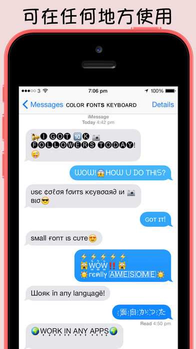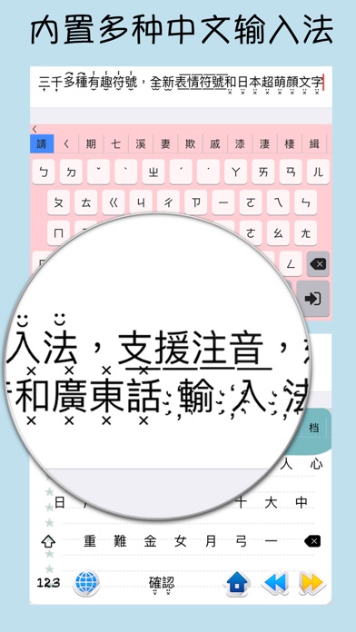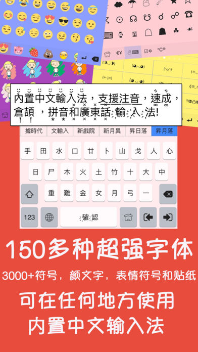 恭҉喜҉发҉财҉!҉新҉年҉快҉乐҉!҉ 适҉用҉于҉中҉文҉ 下载彩色字体键盘,立即在键盘(iOS8以上)直接使用百多种可爱字体,三千多种有趣符号,全新表情符号,日本超萌颜文字和贴纸! 现已内置中文输入法,支援仓颉,简易和拼音输入法。 全新强大的功能: ►从您收到的讯息或互联网收集动画贴纸,GIF和贴纸,直接保存入键盘内重复使用;或与您的朋友分享您收集的贴纸。 ►试试我们的超萌艺人表情符号。 ►三千多种有趣符号,全新表情符号和日本超萌颜文字。 ►使用我们全新的可爱键盘主题或经典彩色键盘主题。 一百多种超酷的字体效果!让你容易地创建超特别的Facebook,Instagram,Twitter个人档案,留言和图片。 适用于任何地方,在任何语言上! 七十多种适用于所有语言的特别字体效果,适用于中文,日文和韩文! 使用超过一百多种不同的字体效果,给你的朋友带来无尽惊喜! - 超酷的Instagram个人档案,留言和照片上的超酷文字 - 特别的推文 - 在 Kik, iMessage, Facebook,WeChat 的有趣信息 “彩色字体键盘”允许你创建古怪的,超酷的,好玩的网络信息和个人档案来表达你的个性。瞬间改变你的Facebook ,微博, 来往, 微信, 陌陌和Instagram的知名度。你将会有更多的赞好,转推和跟随者。准备好你的人气像火箭般一飞冲天,扶摇直上! 与社交网络中的朋友新的有趣的通讯方式。 立即行动,使用百多种最酷的字体,三千多种有趣符号,全新表情符号,日本超萌颜文字和贴纸! 注意: 1.请注意,“彩色字体键盘”绝不会收集任何个人信息或您键入的内容。打开“允许完全访问”是第三方键盘使用剪贴板的iOS的要求,是贴纸功能的要求。 2.有些表情符号是由 http://emojione.com 免费提供