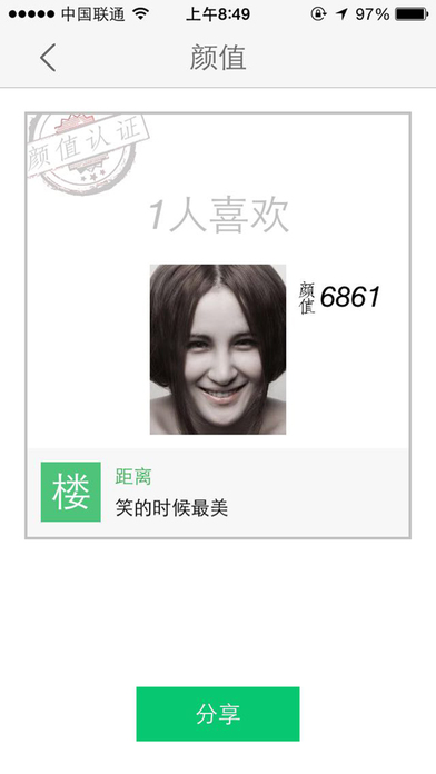 你不仅仅能知道你的外表年龄,您还会知道自己的颜值分数! !!!!!目前最权威的颜值测试软件!!!!!! 分别计算人的眼睛,嘴,鼻子是否是人脸的黄金分割比,来科学的计算您的颜值。 并且你的气质也会影响你的颜值,气质包括你的微笑,肤色,年龄等综合信息计算。快来找你的小伙伴比一比谁的颜值最高!! 颜值:表示人物颜容英俊或靓丽的一个指数,用来评价人物容貌。 很多人颜值都在5000左右,是因为在我们周围大部分人都属于五官端正,就像正态分布的曲线。 同一个人的不用照片颜值不一样,正如一个人可能正脸好看,可能侧脸好看。不同角度看你的美是不一样的。(同一个照片颜值基本相同) 做鬼脸对颜值的影响:我计算的是你眼睛,鼻子,嘴在你整体脸中的位置比例,而不是计算眼睛的大小,鼻子的大小,嘴的大小。所以不会对颜值有太大的影响哦。