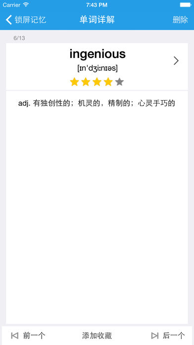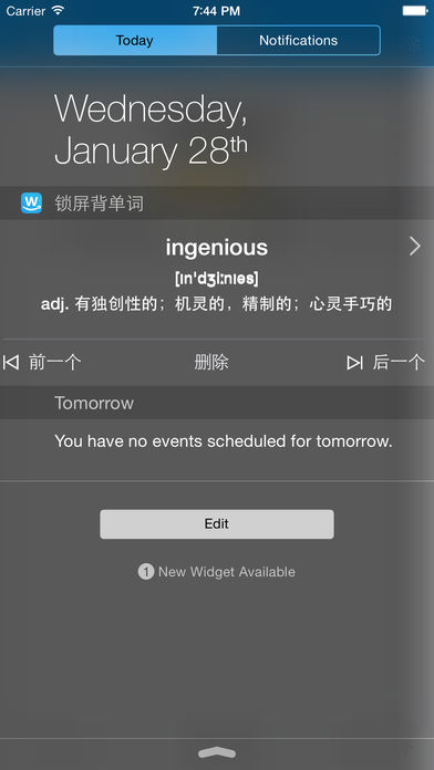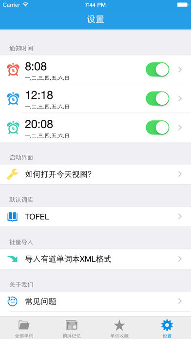 APP主要特征: 1. 第一款利用“今天”视图在锁屏状态下背单词的iOS app 2. 内置CET4, CET6, GRE, IELTS, TOFEL等权威词库。一次购买,即可永久享受 3. 完全自定义单词记忆列表。用户通过“锁屏记忆”和“单词收藏”这两个列表来决定要背哪些单词。 —“锁屏记忆”中的单词累计5次自动删除,“今天”视图中的单词和“锁屏记忆”列表保持一致 —“单词收藏”可用作“锁屏记忆”的备份,这里的单词不会自动删除 4. 与有道词典完美融合 —有道词典查看单词详解 —有道词典添加生词 —导入和导出有道词典单词本.xml格式的文件(示例文件可以去http://www.justzui.com/screenwords/youdao.xml 进行下载),需利用iTunes连接电脑 5. 自定义用户通知。在指定时间提醒单词记忆。 【特别说明】: iOS对锁屏的限制非常严格,本APP实现锁屏背单词主要利用两种技术: 1. 下拉“今天视图”,“今天视图”可以在锁屏状态下拉操作,开启“今天视图”的方法为: — a. 打开设置 -> (TouchID与)密码 -> 锁定时允许访问 -> 【今天】和【通知】 — b. 下拉今天视图 -> 编辑 -> 添加锁屏背单词 -> 完成 2. 利用iOS本地通知提醒背单词,请在第一次使用时【允许发送通知】 — 如果发现APP没有通知,打开设置 -> 锁屏背单词 -> 通知 -> 允许通知,提醒的单词全部来自锁屏记忆列表,单词提醒时间可以在设置中选择 之前有童鞋抱怨单词并没有在锁屏上出现,特此说明,其他操作上的问题可以访问: http://www.justzui.com/screenwords/index.html 【如何导入windows电脑中的有道单词本】: 1. 从有道单词本中导出到.xml文件。具体步骤为:a. 打开有道单词本,选择管理->导出到文件->导出; b. 保存类型选择xml类型,这样您就可以看到生成的.xml文件 2. 用iPhone(或者iPad)连接电脑,打开iTunes,在iTunes中选择应用程序->文件共享,在文件共享中选择锁屏背单词,点击添加文件,这样就可以把刚才导出的.xml文件导入。示例文件可以在http://www.justzui.com/screenwords/youdao.xml 进行下载。 3. 在iPhone中打开锁屏背单词,进入设置->导入有道单词本XML格式,选择您刚才从电脑传输到手机的文件,最终选择导入即可,您的单词会被导入到单词收藏列表中,您也可以把这些单词再添加到锁屏记忆列表