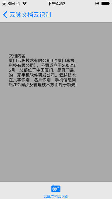 产品描述 云脉文档云识别应用软件是云脉科技公司提供的光学字符识别技术(OCR)演示软件,手机端提交要识别的内容,云端服务器执行识别任务,并迅速返回识别结果。用户可以用这个手机应用软件体验云脉光学识别技术在文档识别中的应用。 功能特点 - 支持用手机直接拍摄提交识别对象; - 支持导入手机相册中的图片提交识别对象; - 云端服务器执行识别任务,识别速度快; - 界面简单,操作便捷。 识别语言 中文(简/繁体)、英文、德语、丹麦语、法语、意大利语、西班牙语、葡萄牙语、瑞典语、芬兰语、挪威语、荷兰语。 设备要求 支持iPhone 4及以上的设备/iOS 6.0及以上的操作系统。