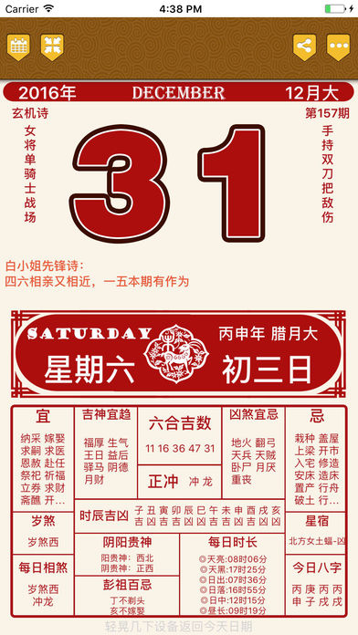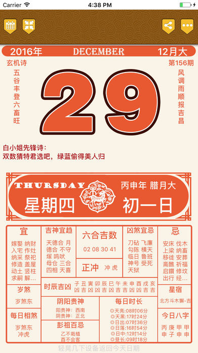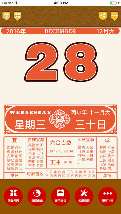 老黄历六合专业版,优惠消息:15号开始限免5天时间,赶紧下载。 最专业最权威最新的老黄历查询,亦是最经典的黄历版本。 2017老黄历六合专业版,记载每日公历、夏历日期、干支、节气、宜忌、中国传统节日等。 并且专门针对iOS 10.x进行设计,在完全兼容旧系统的基础上,提供iOS 10.x下的最舒适的操作体验,最快速的操作反应。 最新版本: 1. 支持iPhone 7, iPhone 7 Plus, iPad Pro 2. 支持 iOS 10.x,完全兼容iOS 6.x/ 7.x/ 8.x/ 9.x 旧版本系统 3. 更新到2017年最新数据 4. 新增黄历转公历,公历转黄历功能。 强烈建议升级。